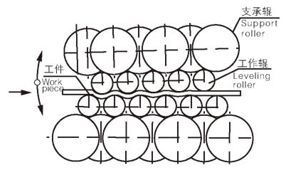 利用多輥工作原理,使板料在上、下校平輥之間反復(fù)變形,消除應(yīng)力,達(dá)到校平的目的。在上、下排工作輥外側(cè),設(shè)剛性支撐輥(輪),構(gòu)成四重式組輥結(jié)構(gòu)。板料通過本機(jī)校平,可明顯改善其平整狀態(tài),提高工件的質(zhì)量。